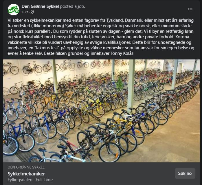 Den grønne sykkel i Bergen har vært ute med ny stillingsannonse. Man kan mene hva man vil om vaksiner og faren ved disse, men å gå ut på den måten som det gjøres i stillingsutlysningen og være tydelig på at man diskriminerer på bakgrunn av at man har tatt vaksine, er jo ikke bare umoralsk, men også ulovlig...