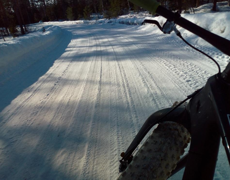 Sykla rundt Ring 4 på søndag med start ved Hammern. Syklet med grus-racer med 40mm piggdekk. For det meste hard is som gav relativt godt feste. Størst problem var det der det var smeltevann som hade lagt seg oppå gammelisen og frosset til - der var det lettere at det slapp, spesielt der det var langsgående spor i tillegg.