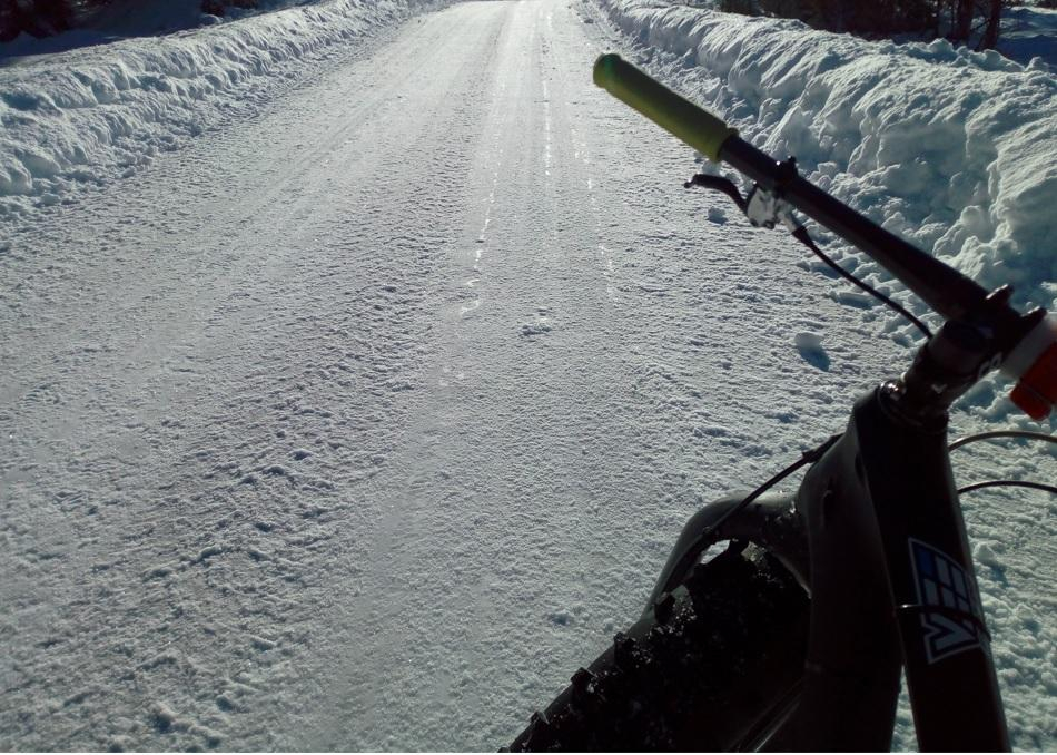 Det har vært skiløyper der, så vil variere mellom hardt og glasert når det har vært minusgrader og mykt og slushy når det er varmegrader. De få stedene som brøytes vil være mye bart, men kan være noe is her og der.