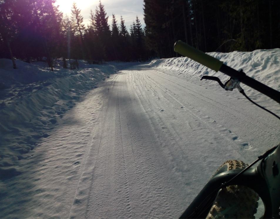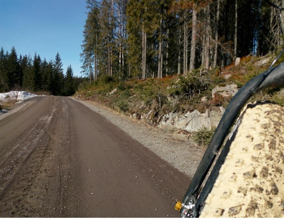 Sykla rundt Ring 4 på søndag med start ved Hammern. Syklet med grus-racer med 40mm piggdekk. For det meste hard is som gav relativt godt feste. Størst problem var det der det var smeltevann som hade lagt seg oppå gammelisen og frosset til - der var det lettere at det slapp, spesielt der det var langsgående spor i tillegg.
