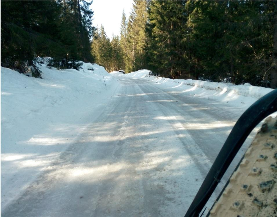 Samme med veien opp til Tømte. Lange strekk er tørre (bilde 1), men også lange strekk med speilblank is.