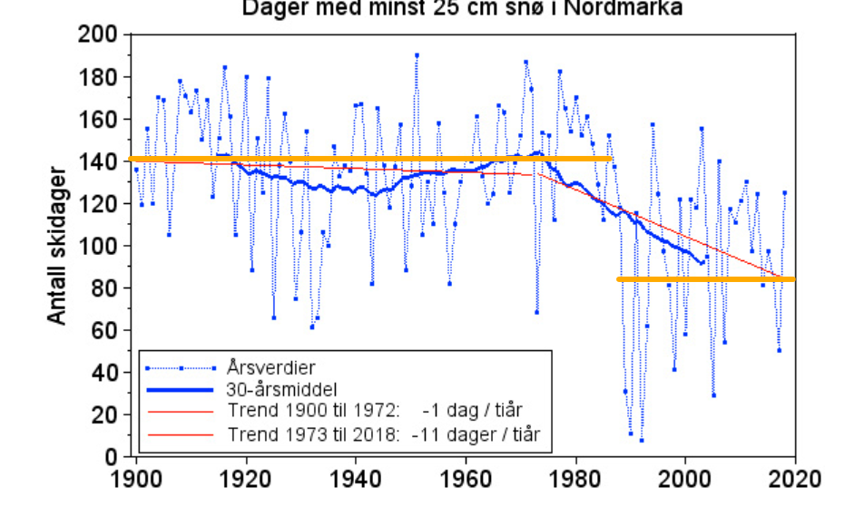 Man kan också se den datan som en regression som er rimeligt konstant fram till slutet på 80 talet och en till rimeliget konstant regression efter det på en lavare nivå. Alltså det jag skrev. Antal skidagar i åren med sämst skiföre har uppenbart också gått opp de senaste 30 åren.