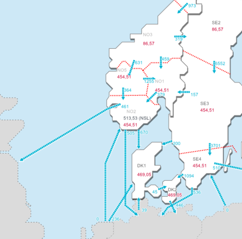 Lite vann, väldigt höga priser i sör. Export mot kontinenten 1635 MW, in i N02 = 767 MW och in i hela sörnorge 1247 MW. Så området med lite vann och lite insig netto eksporterar ström.