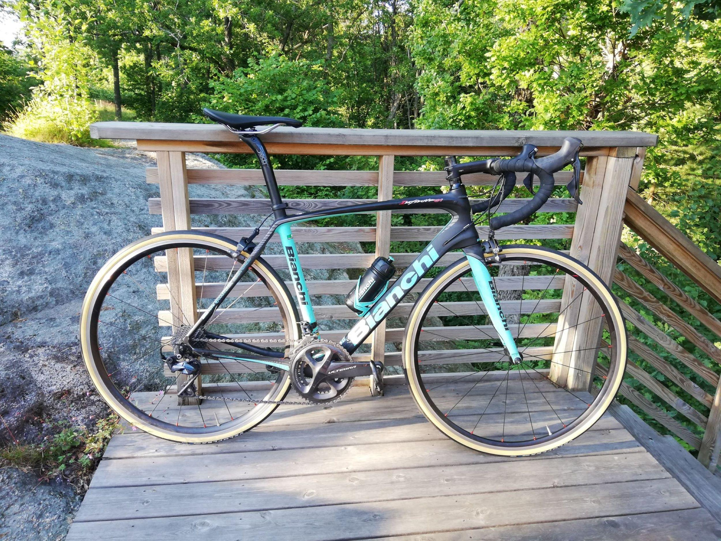 Samme som i fjor. TCR Adv pro komplett orginal foruten Michelin power road i 32mm og byttet styret til 400mm(Prime Primavera X-light carbon) bredt fra orginale 440mm. Overraskende nok gikk da vekten opp med noen gram.. Klokker inn på 7,8 med 32mm dekk og dobbel styretape. Helt ok i str L.