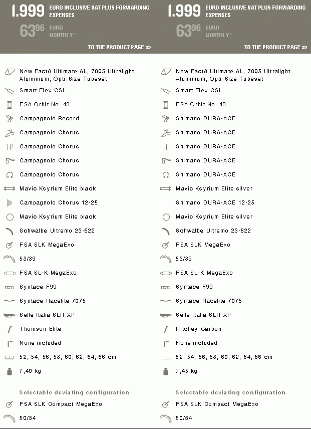 Du velger altså Dura-Ace til 4 000 mer:), eller Campa. Siden dette ikke er en Italiensk sykkel er ikke Campa obligatorisk, liker du at det ikke er tvil om du har giret eller ei, så er vel Campa noe for deg, tenker du utelukkende på funksjon(og enklere deletilgang)så er Shimano tingen.