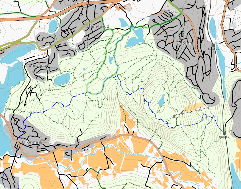 grønt kart: rute fra Asdøltjern til Gupu. ruteplanleggeren har stort sett valgt veier og traktorveier.