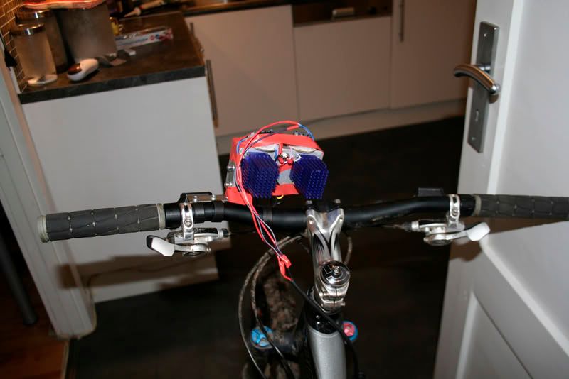 I utgangspunktet er dette et prosjekt for å finne ut om delevalget er noe tess. Lyser LED'en nok? Er lysbildet bra? Får jeg kontroll på kjølingen? Men med noe klar plast foran på reflektoren og en metallbøyle for festing av "lampa" til hjelmen, så har jeg forsåvidt en løsning som bør kunne holde til stibruk. Ikke så elegant, men sannsynligvis robust nok.