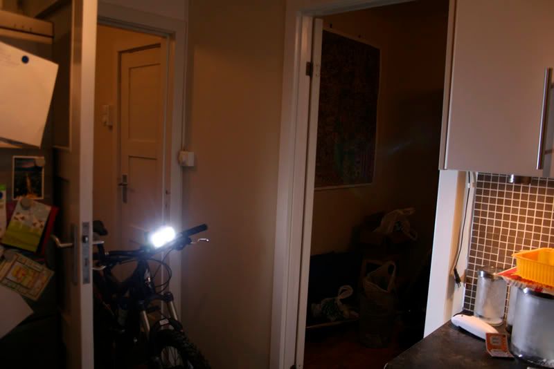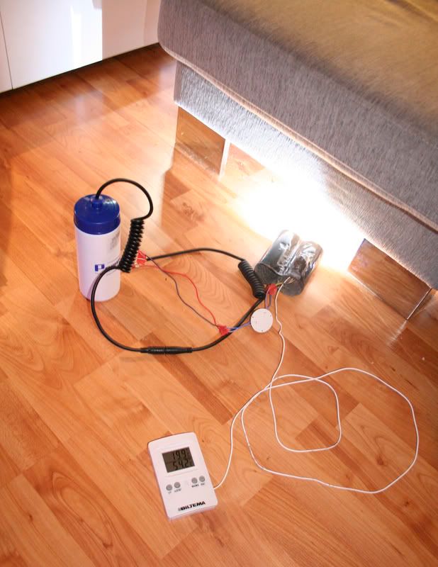 Testing, lyser så grønnjævelig at jeg måtte legge den under sofa'n for å spare vrede fra en tv-tittende samboer. Poenget var å sjekke om den klarte å kvitte seg med varmen, LED'n tåler visst ikke mer enn 60 grader. Da jeg skrudde av tikka tempen opp til 64 grader :: Da starter jakten på nye kjøleløsninger, får se om jeg ikke finner på noe lurt. Jeg har delvis "lagd" meg problemer i og med at karbon leder varme vannvittig dårlig.