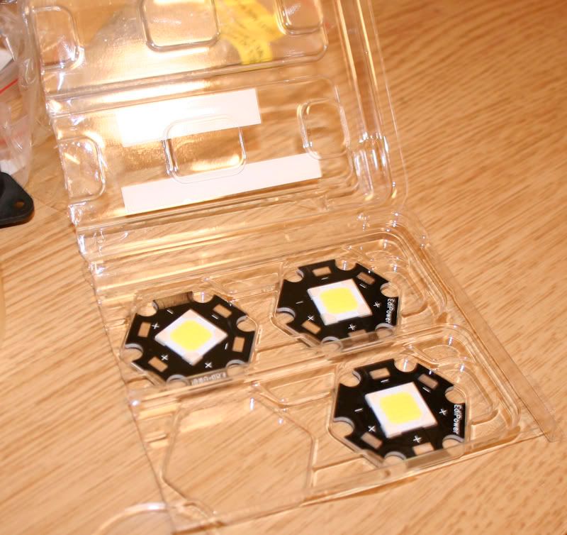 Reflektorer var vanskelig å finne på nettsjappene og det tok sin tid. Når DX i tillegg er svartelistet av Posten var det få alternativer igjen. Jeg endte opp med å ta en runde på Clas Ohlson, der fant jeg to 5W spotlight med 12 grader spredning. 29,- betalte jeg, fornøyd med det. Tok de med hjem, og prøvde kapping med Dremel. Standard kutteskivene var selvfølgelig ubrukelig, så jeg måtte krype til korset og handle inn diamantkutter. Det letta meg for litt over 200 spenn, men den kommer sikkert til nytte igjen. Kapping gikk greit på første forsøk, men nr 2 ble desverre litt ødelagt. Virka som varmeutviklingen under kapping fikk den til å sprekke. Kappe saktere neste gang er tydeligvis trikset.