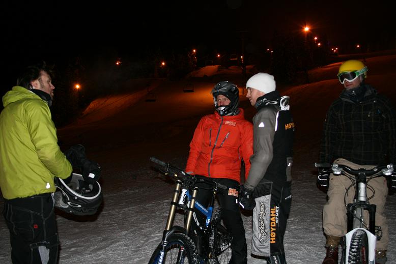 Ja takk for fin kveld i går. Synd at det ikke dukket opp flere (ca 30 stk) men avlysninga forrige helg og 8-10 minus grader får ta litt av skylda. Jeg koste meg i hvertfall med de 5 turene jeg kjørte. Kunne nok kjørt 10-15 turer hvis jeg hadde stått på i de 2t 30 minuttene heisen gikk men ble mye skravling i bånn som vanlig. Og ja Svenn jeg fikk meg en real luftetur. Hadde alt for stor fart inn i en slak sving og ble dratt lenger og lenger ut av løypa. Selv om jeg fortsatt var godt inne i løypa var de løst og forhjulet skar igjennom med resultat at jeg tok en salto og min nye Giant Glory DH traff meg godt i bakhodet. Håper vi kan finne en annen helg som passer for flere utover vinteren.