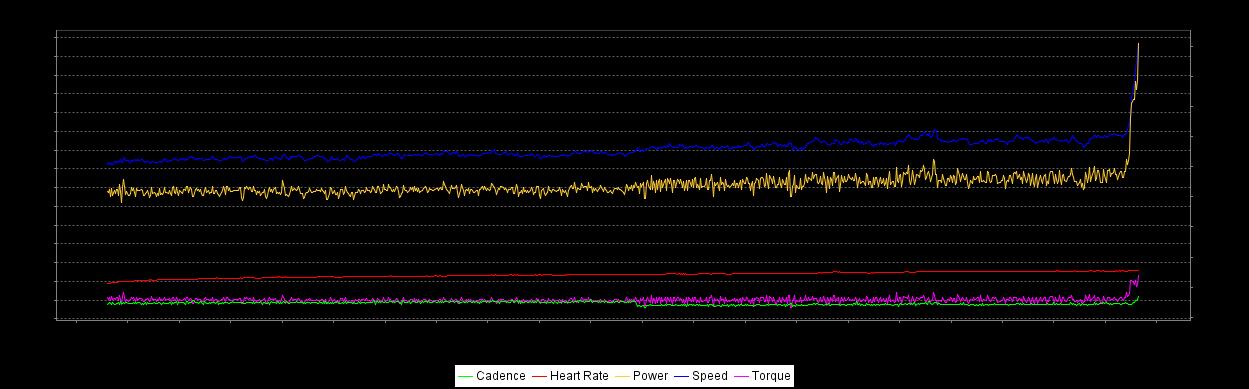 Jeg følger aldri med på puls når jeg kjører tester. Taktikken har vært å starte på en watt som jeg mener jeg burde klare å holde. Hvis ting kjennes bra etter 1 min legger jeg på litt ekstra og holder denne intensiteten i 3 - 4 min. Fra derav og inn gir jeg alt.