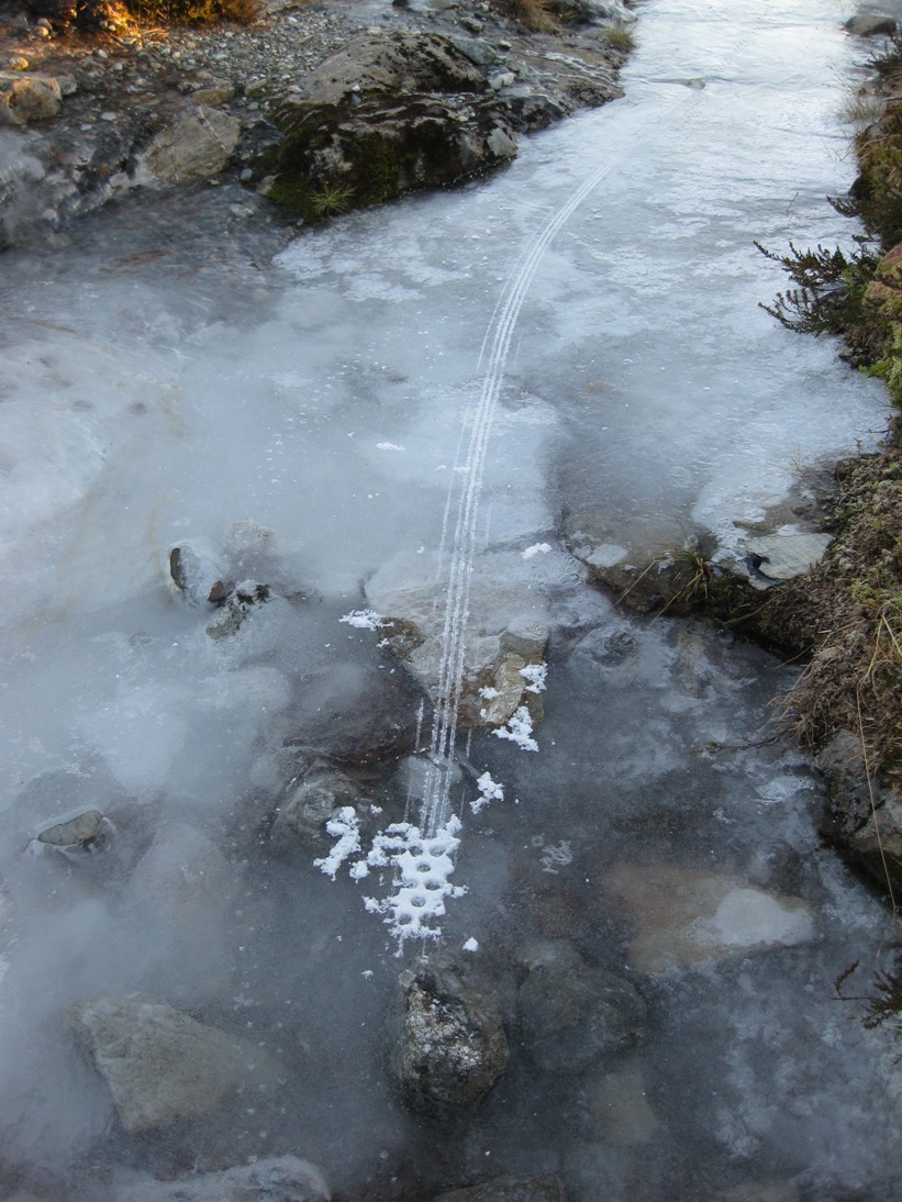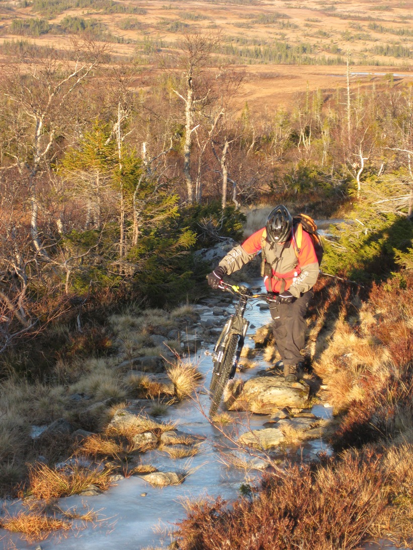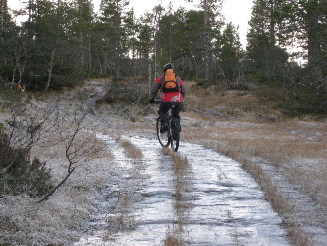 Den store forskjellen fra tirsdag var snøens bæreevne. Kunne ikke sykle en meter på snø, og det gjorde turen på Fersvola litt tung/lang. Et døgn med mildvær tar ikke frosten i bakken og isen, men dekker alt med 1cm vann. Ble våt og kald,ja.